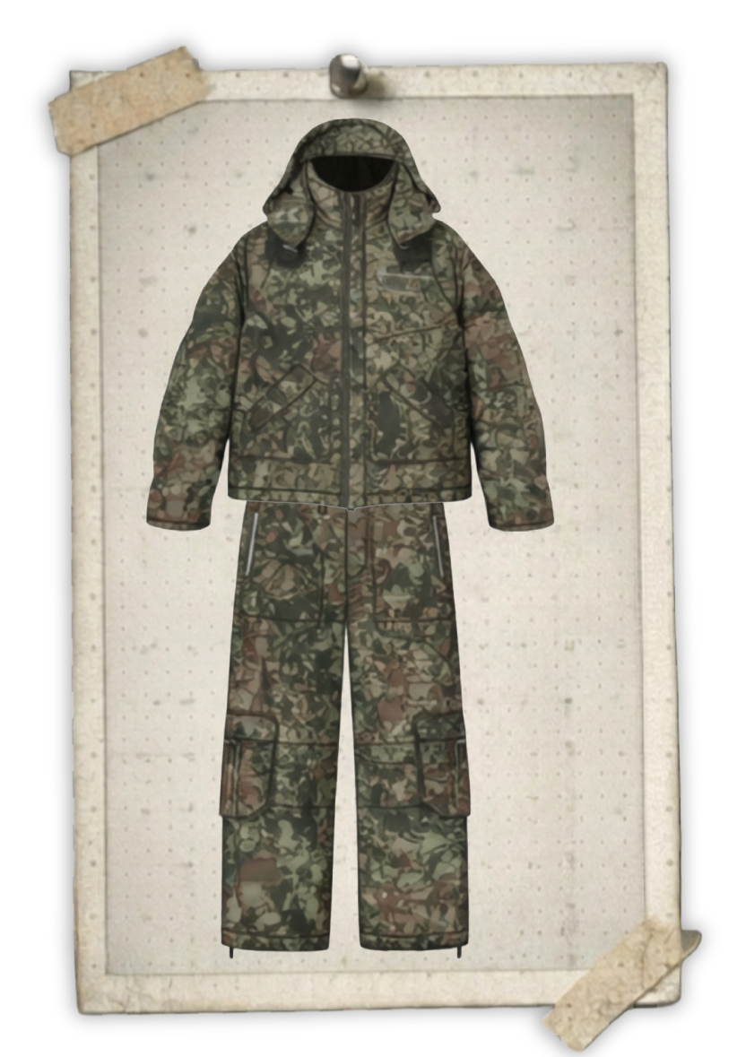 Insulated jacket and pants designed for winter camouflage and rough conditions.
