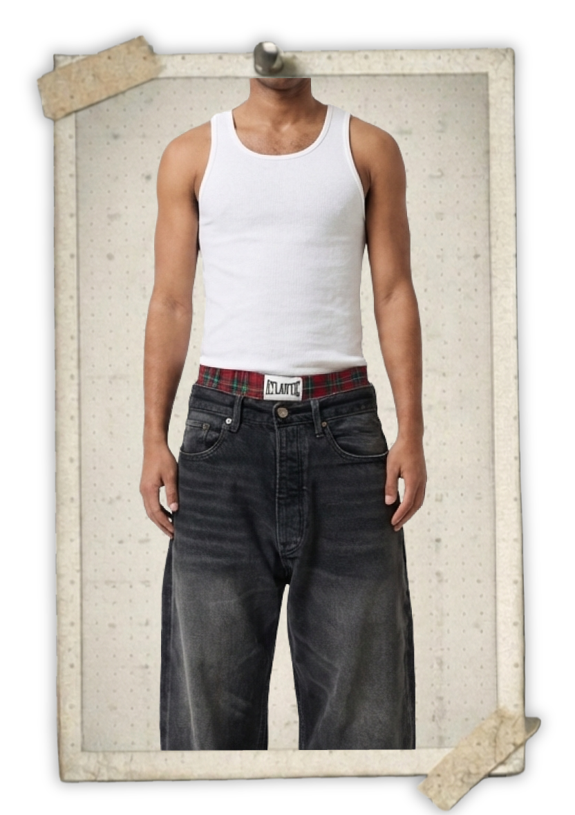 Classic tank and loose dark denim with tartan belt.