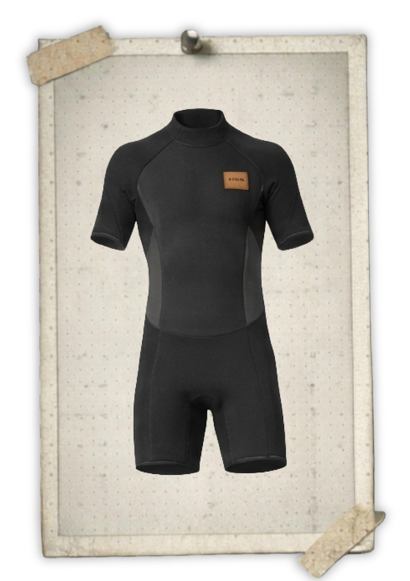 Light & flexible 2mm shorty wetsuit for warmer waters (68°F).