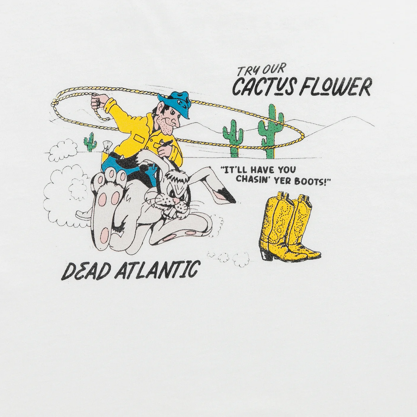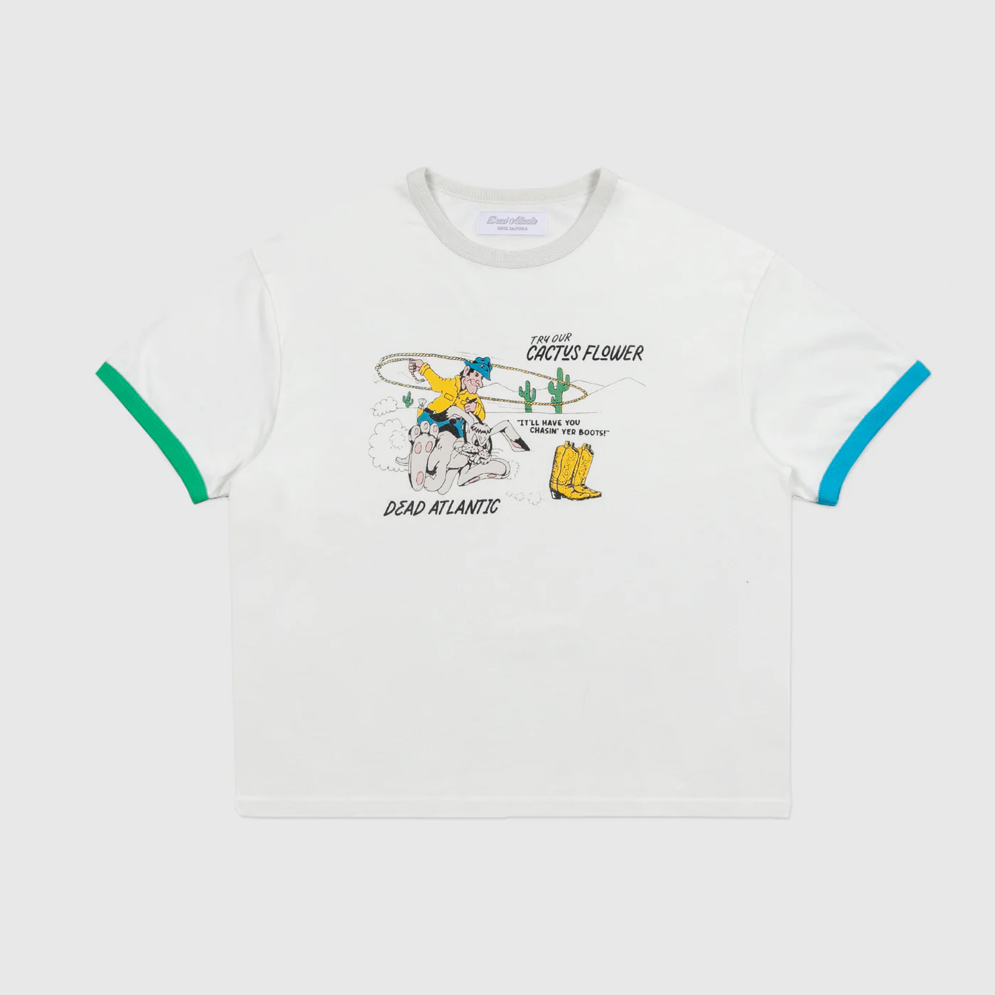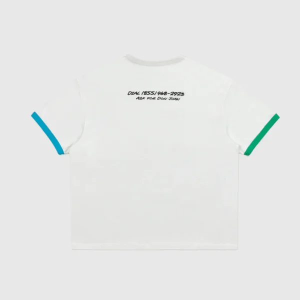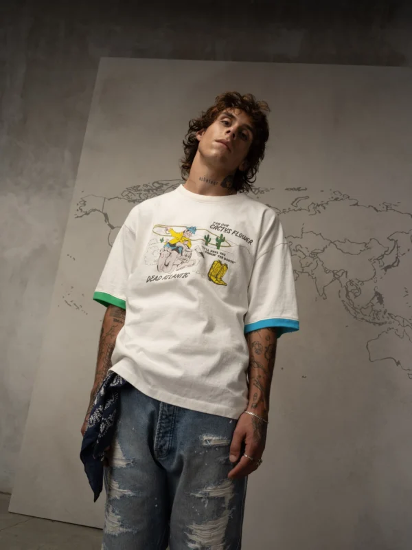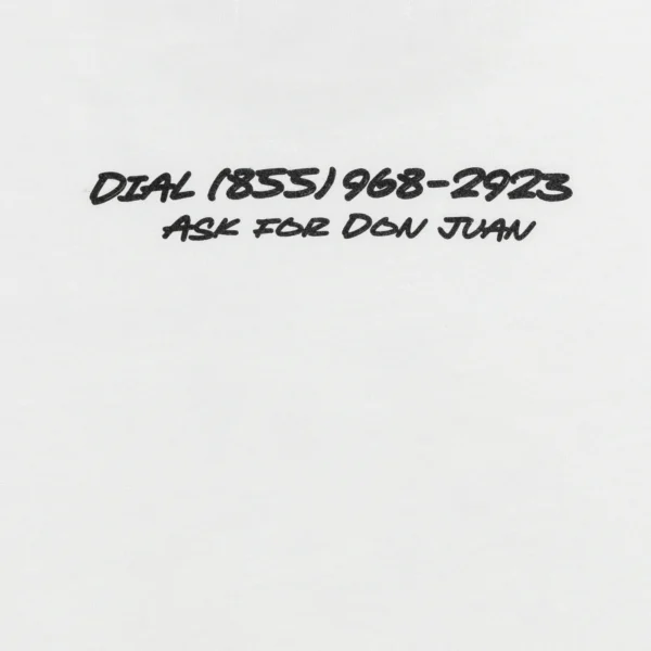 The Don Juan tee features a cactus cowboy distressed print on chest and phone number graphic on back with contrasting ribbing on the cuffs of the sleeves. Each one of these garments undergoes a unique wash and dye process, and graphic fading. Each garment has its own characteristics and that is the intention.