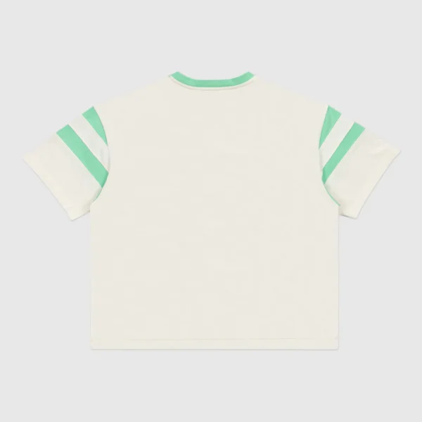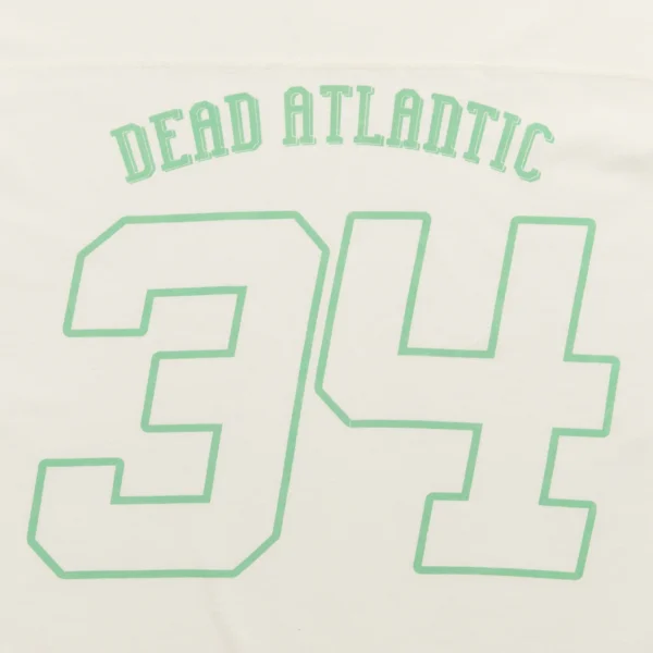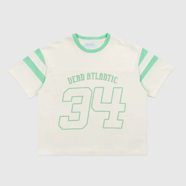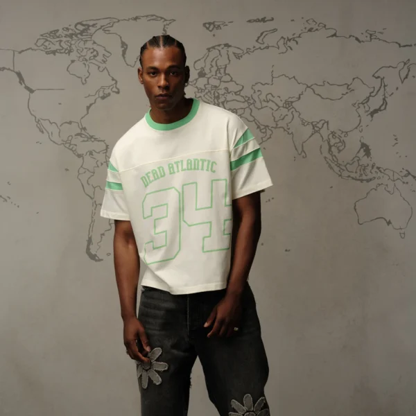 The football t-shirt is inspired by the classic football jersey silhouette. It uses a natural color off-white dye and faded stripes and neck ribbing with distressed graphics to echo the vintage inspiration of old collegiate jerseys. Each one of these garments undergoes a unique wash and dye process, and graphic fading. Each garment has its own characteristics and that is the intention.