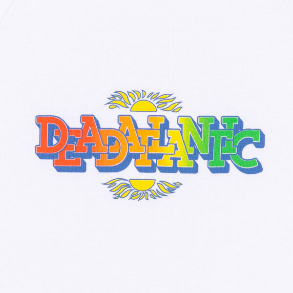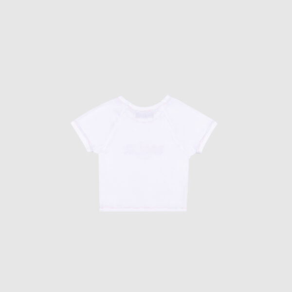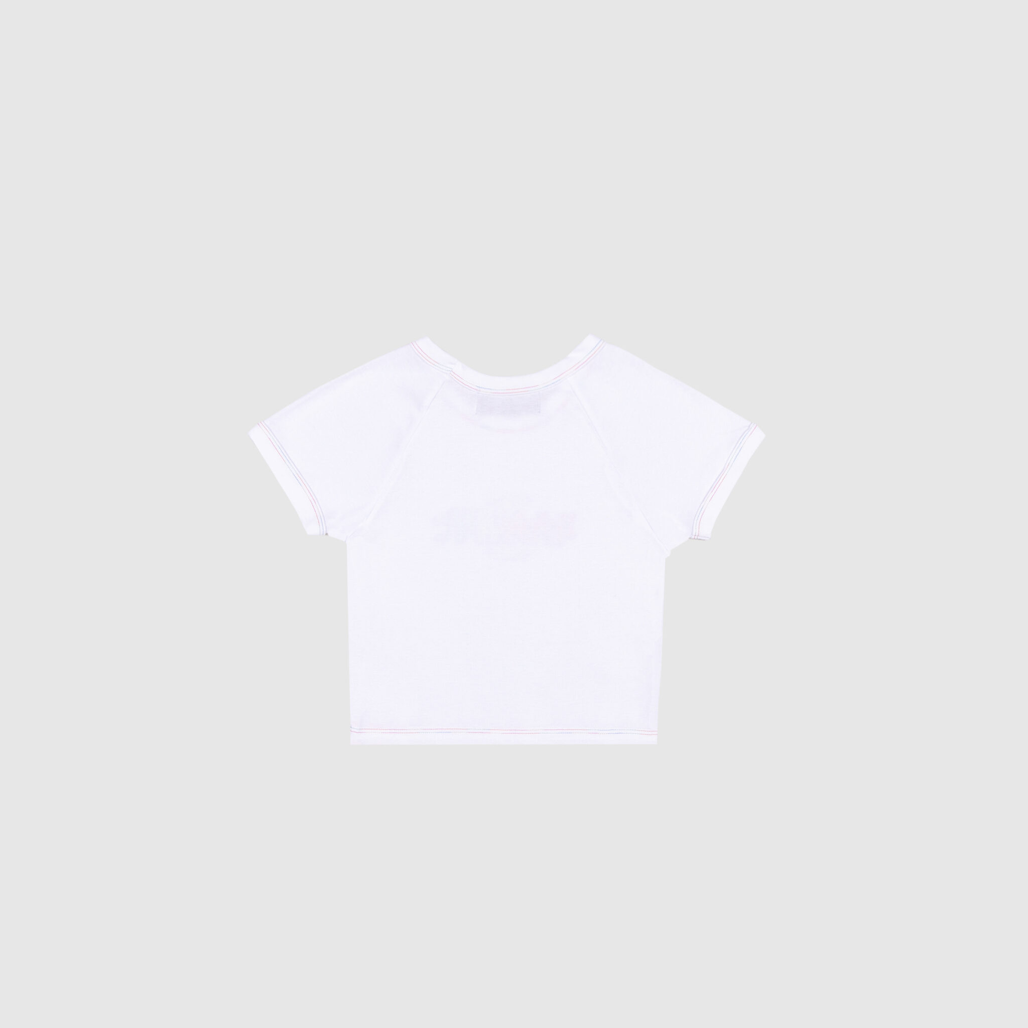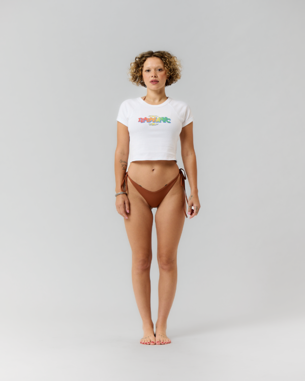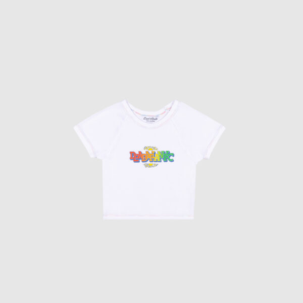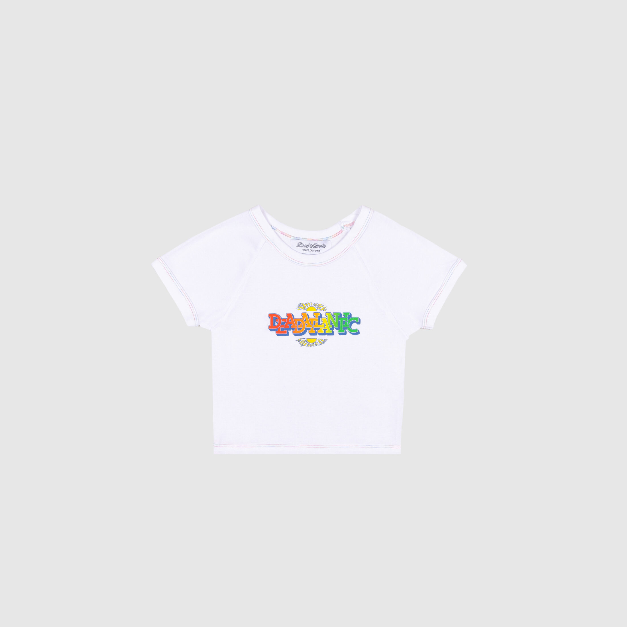 The Paradise baby tee uses a gradient print and multicolor stitching to bring pops of color to a white tee. The font, sun graphic and color scheme are inspired by the nostalgic gift shops shirts from the tropical climates that feel like paradise.