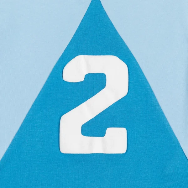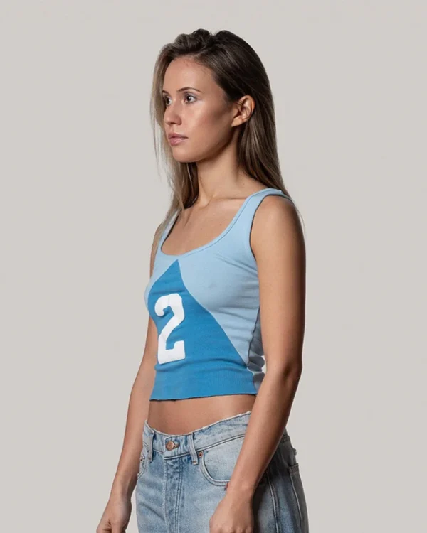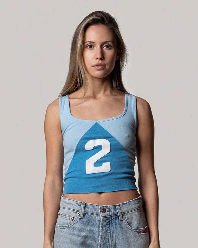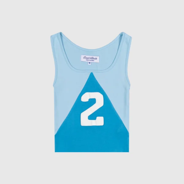 The split tank was inspired by vintage women’s athletic gear which was designed for mobility while maintaining an essence of sophisticated style. It features a two-tone triangular stitch cotton fabric with a thick puff-print “2” on the front and raw edges at the bottom.