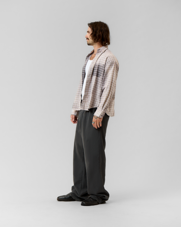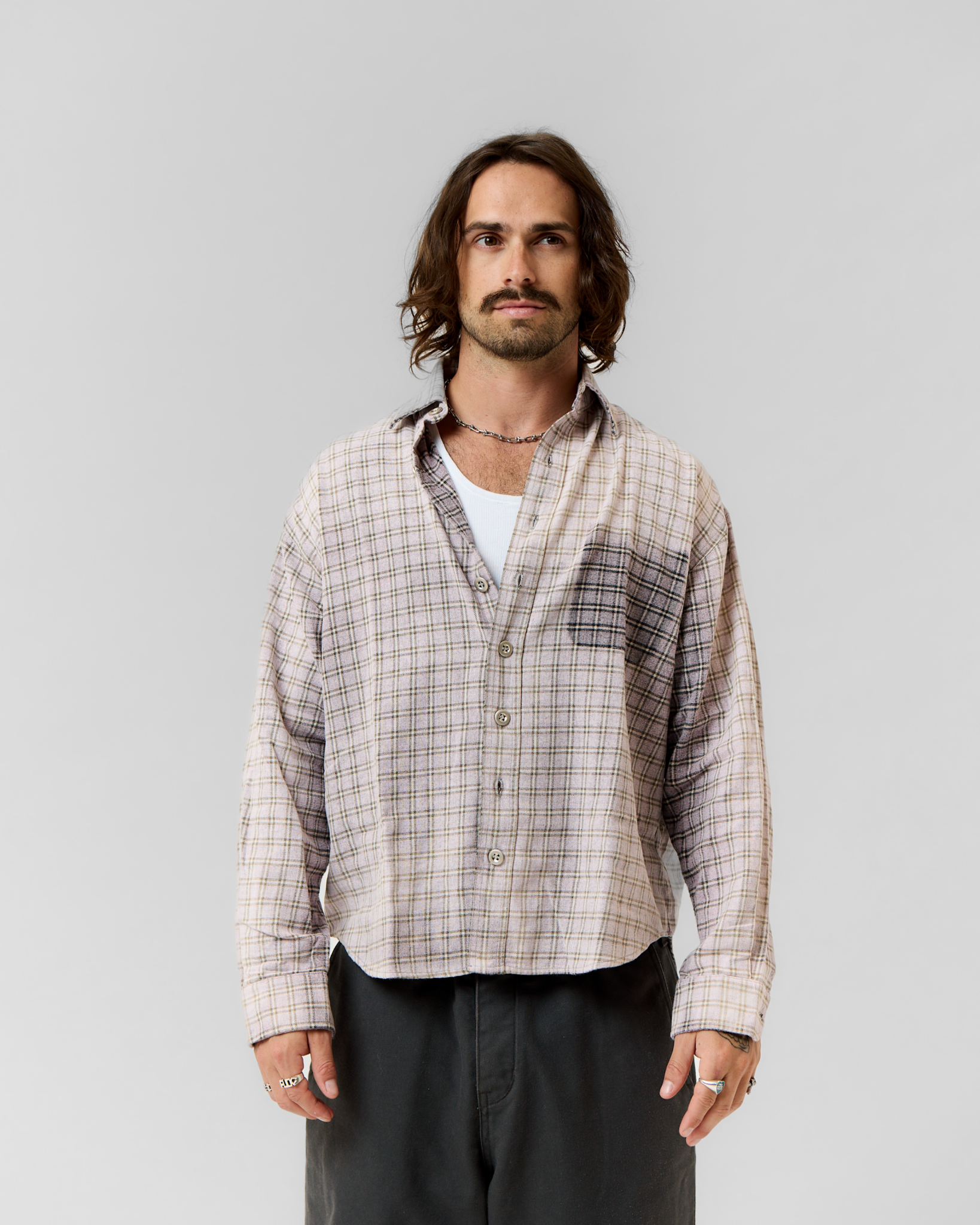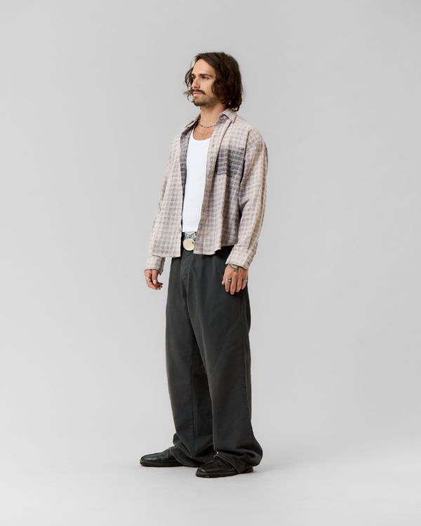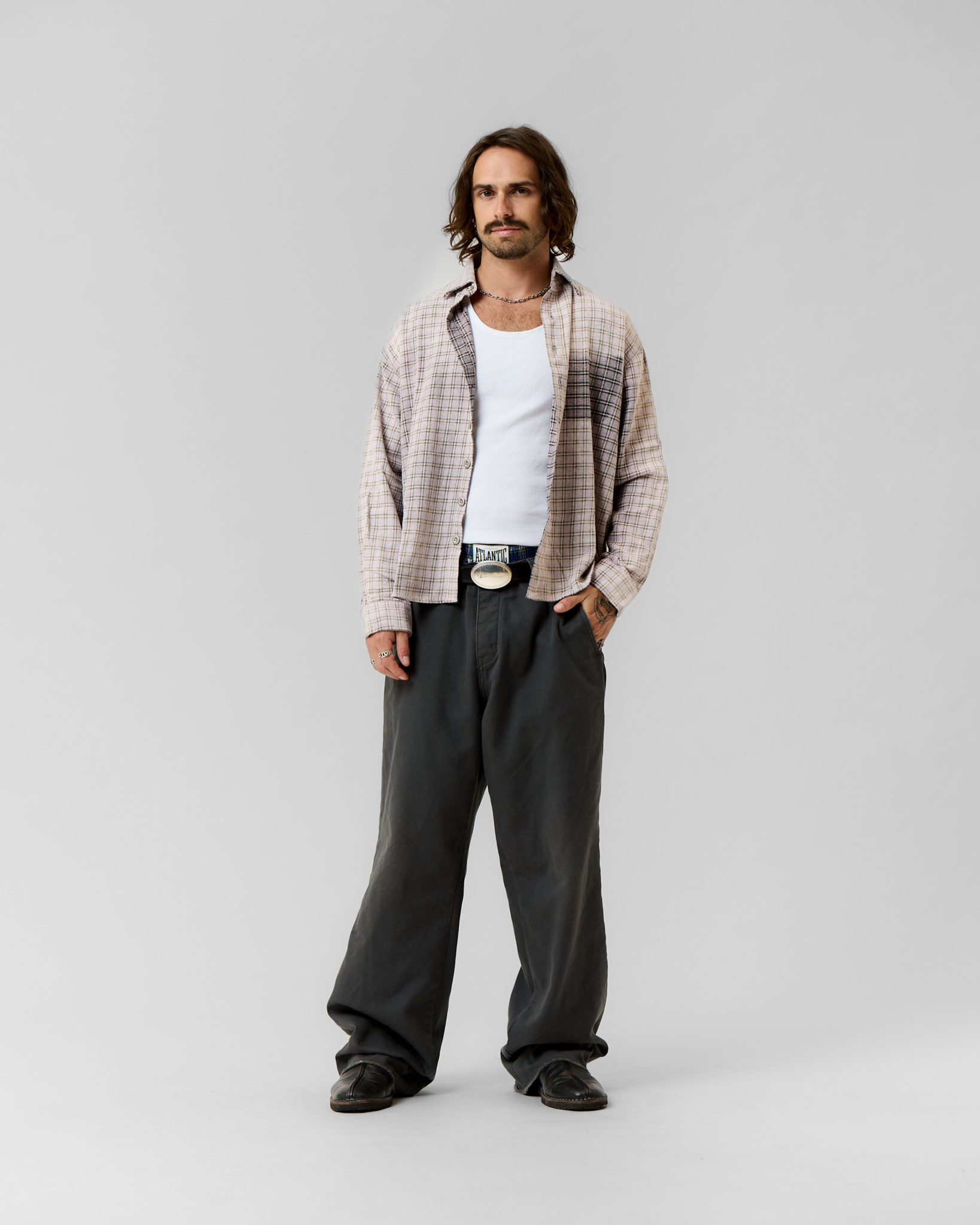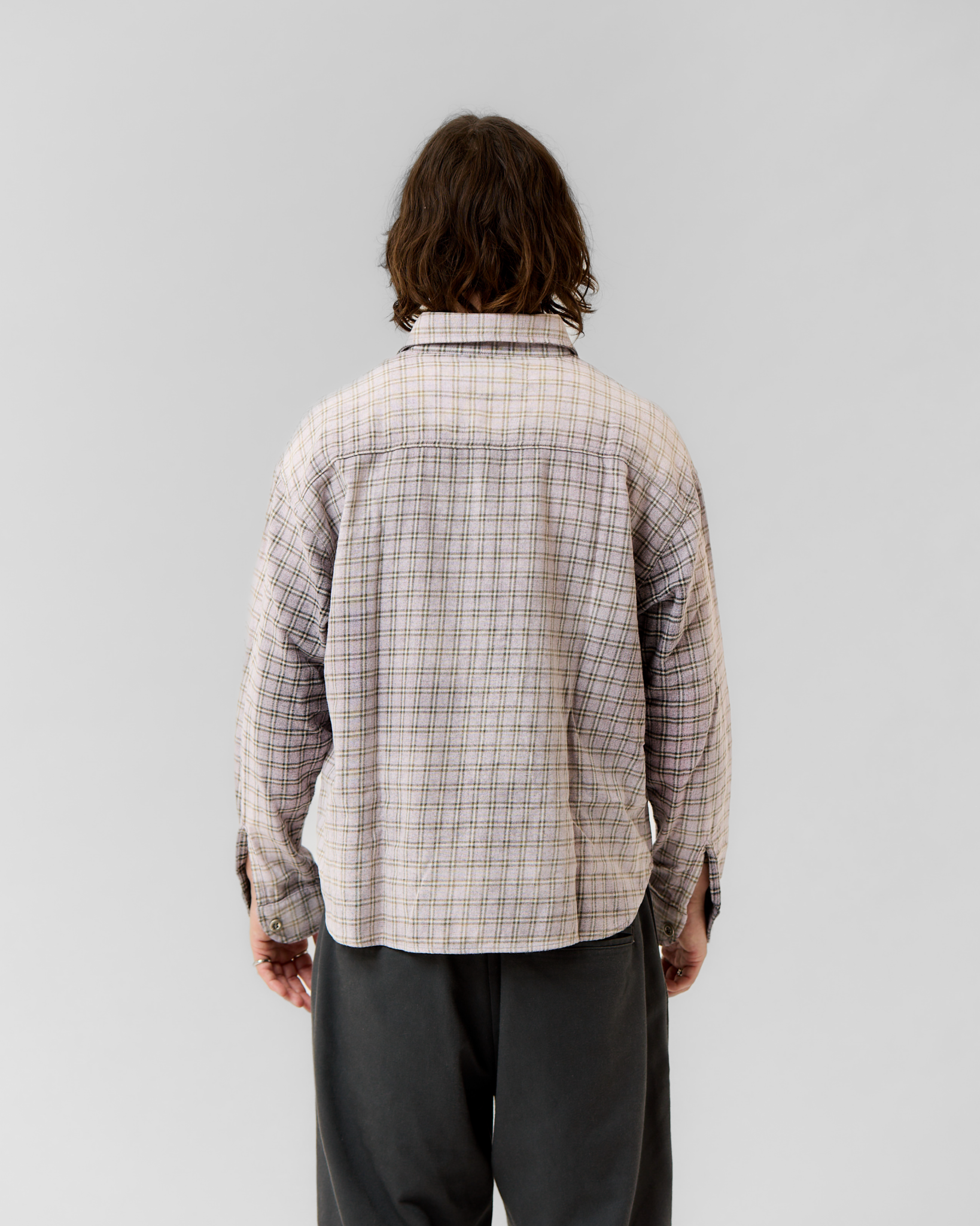 Our faded flannel button-up featured a lightweight Japanese flannel fabric that has been faded and washed to accentuate the natural wear and tear cycle. The exterior left pockets were removed post wash to show the original color.