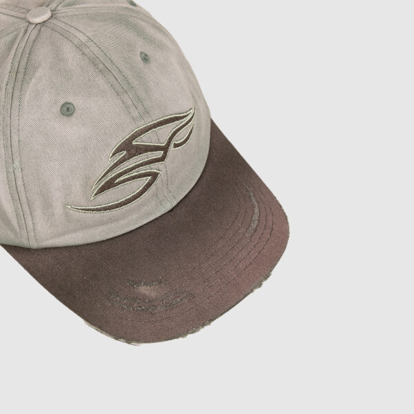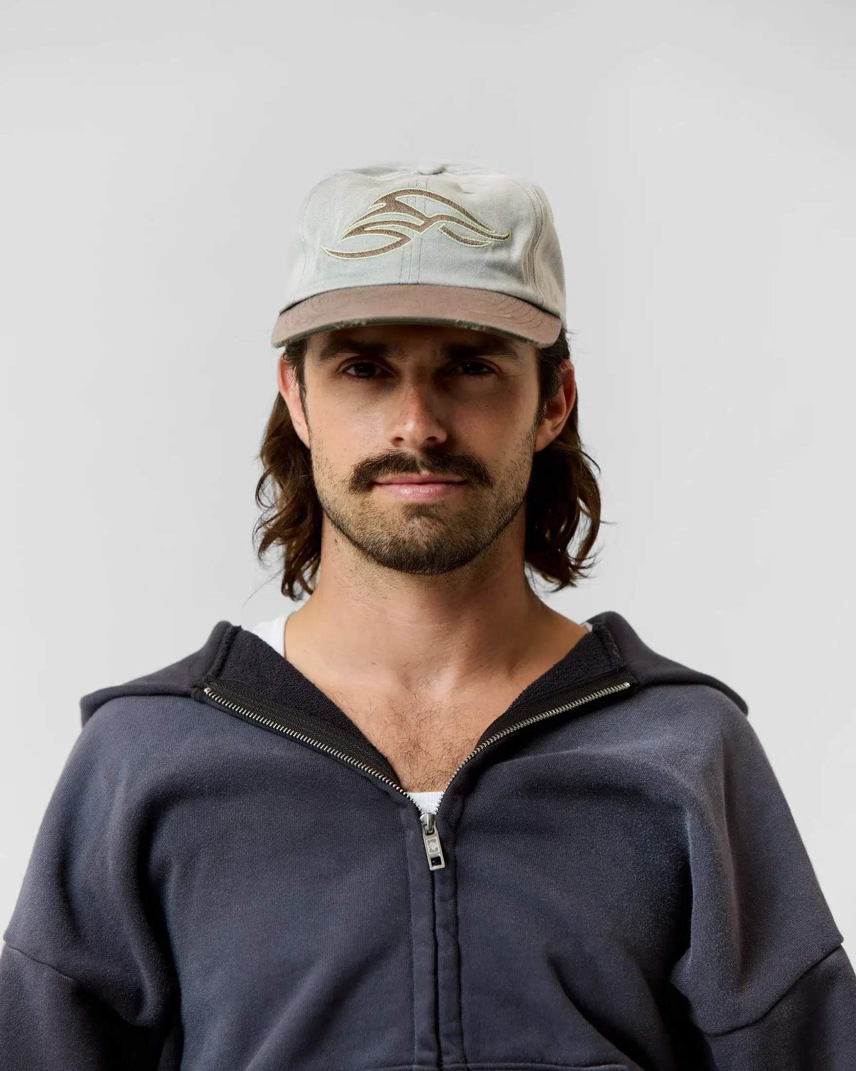The wave hat uses an abstract wave design and light distressing to give a timeless vintage feel to this piece. We crafted a classic two-tone design by giving it a soft washed stone color body and a darker brown bill. Each one of these garments undergoes a unique wash and dye process, distressing, and fading. Each garment has its own characteristics and that is the intention.